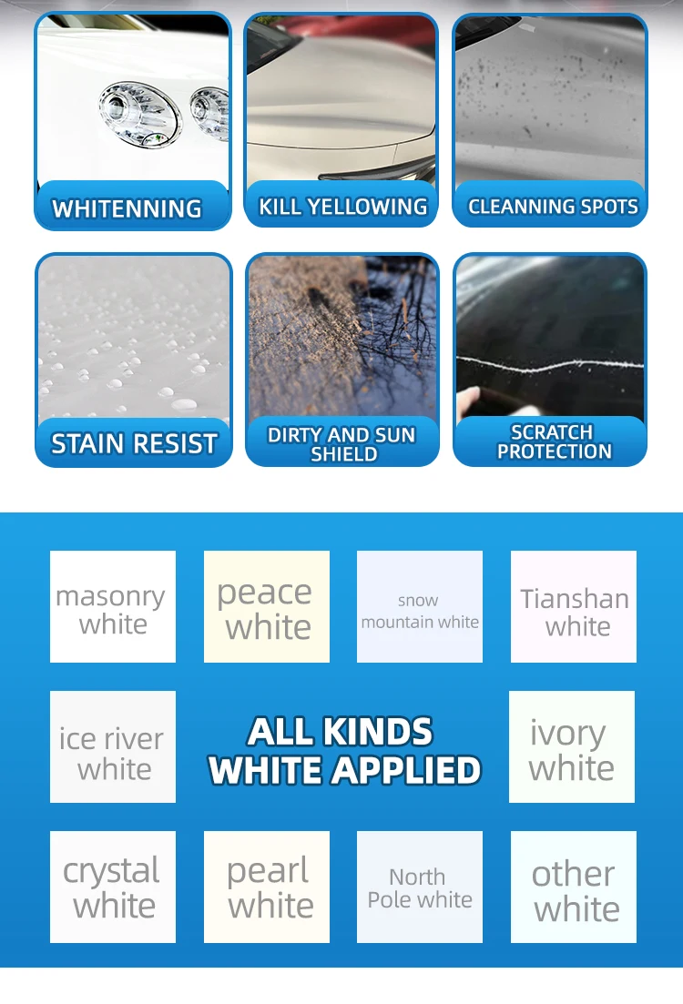 1.Uses: used for waxing, glazing, protecting, whitening, treating yellowing, dullness and fading of white car paint