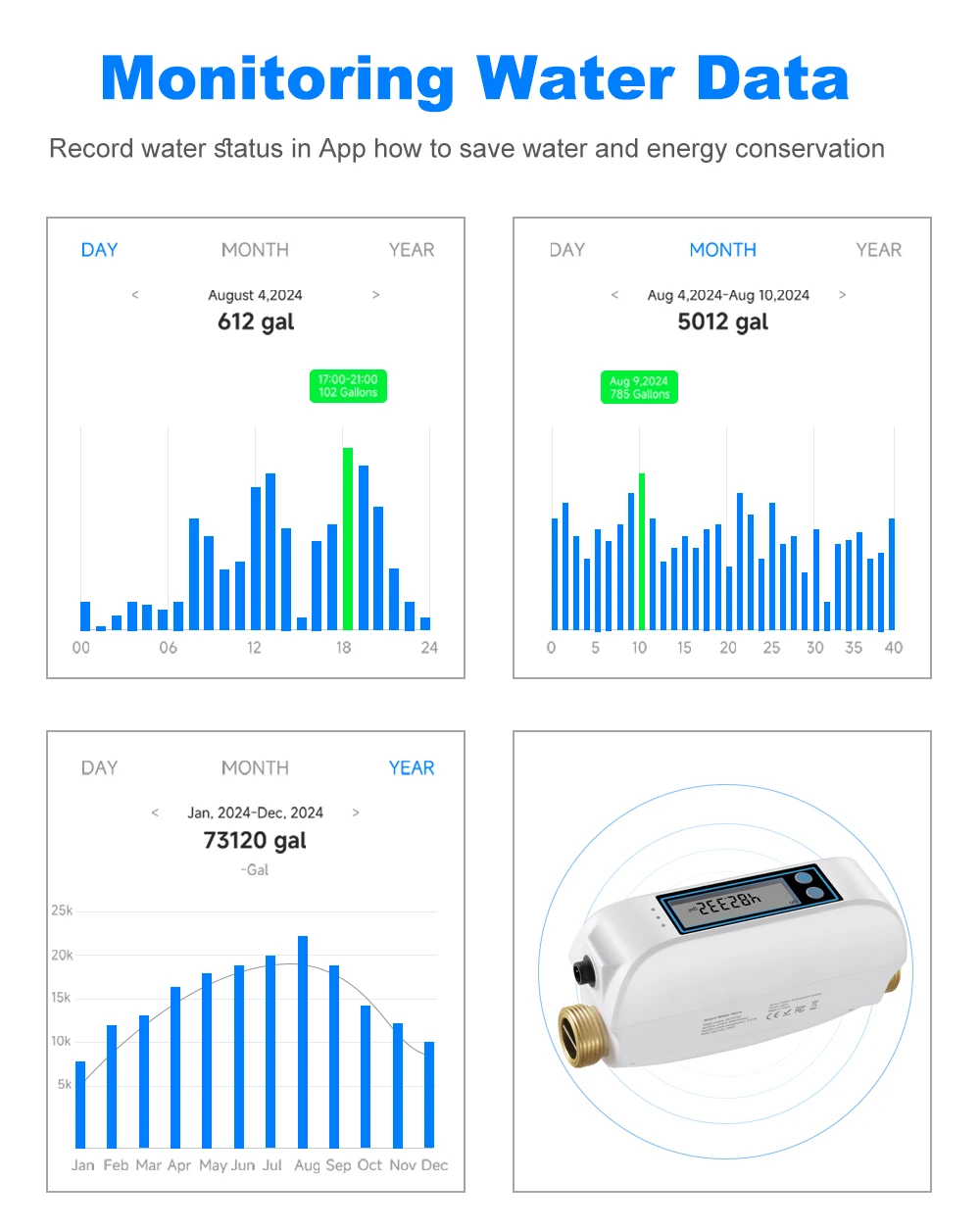Monitor water consumption and water flow: Adopts W-type ultrasonic water flow measurement technology, which is accurate and reliable. In addition, you can monitor the water flow in real time on the LCD display and mobile phone application, and monitor the total water consumption in the application.