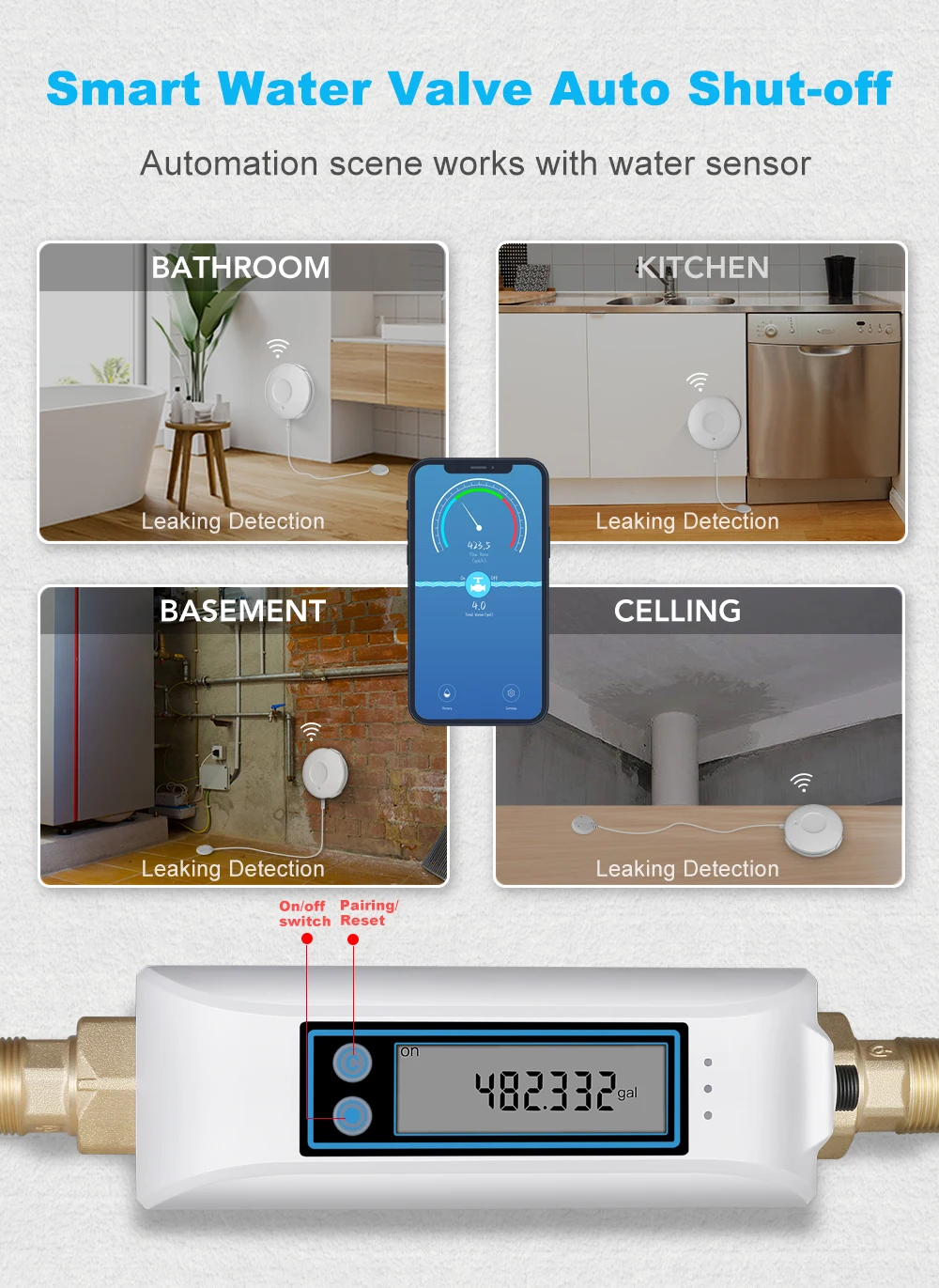 Automatic Shutoff: The WiFi Smart Water Valve can track water usage, single water usage, real-time water flow readings on the APP and LCD display, and total water usage on the mobile APP. You can set scenes through the app based on this data. The water valve can be automatically shut off to prevent damage, for example, when water usage exceeds 1,000 gallons per day, or the flow rate exceed 800 gallons per hour, or a single water usage exceeds 60 minutes, the valve is automatically shut off.